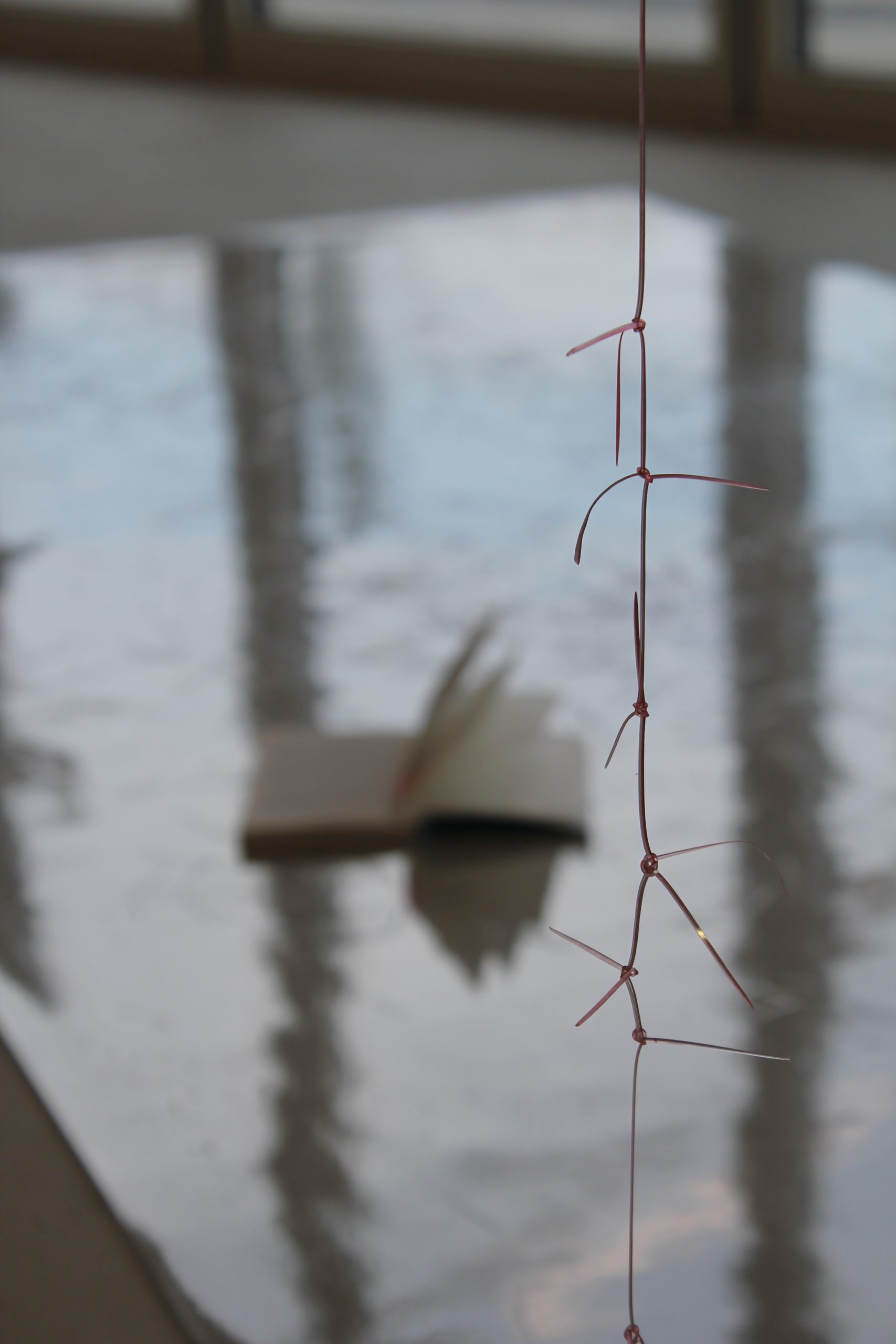 Christina Kehrer/Lapas, bearbeitete Plastiktischdecke, Linoldruckfarbe, Draht, Papier/Wiese, bearbeitete Plastiktischdecke/Klettenkraut, verknotete Plastiktischdeckenschnittreste/Buch über die Wiese, Linoldruck, Karton